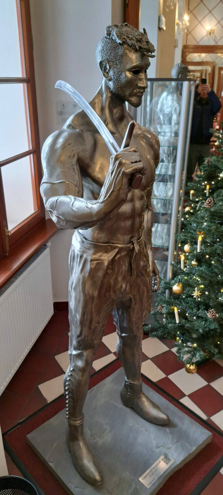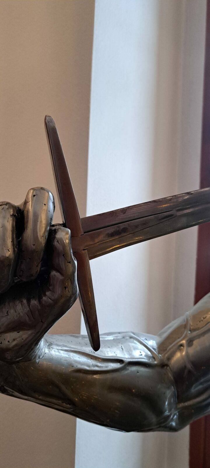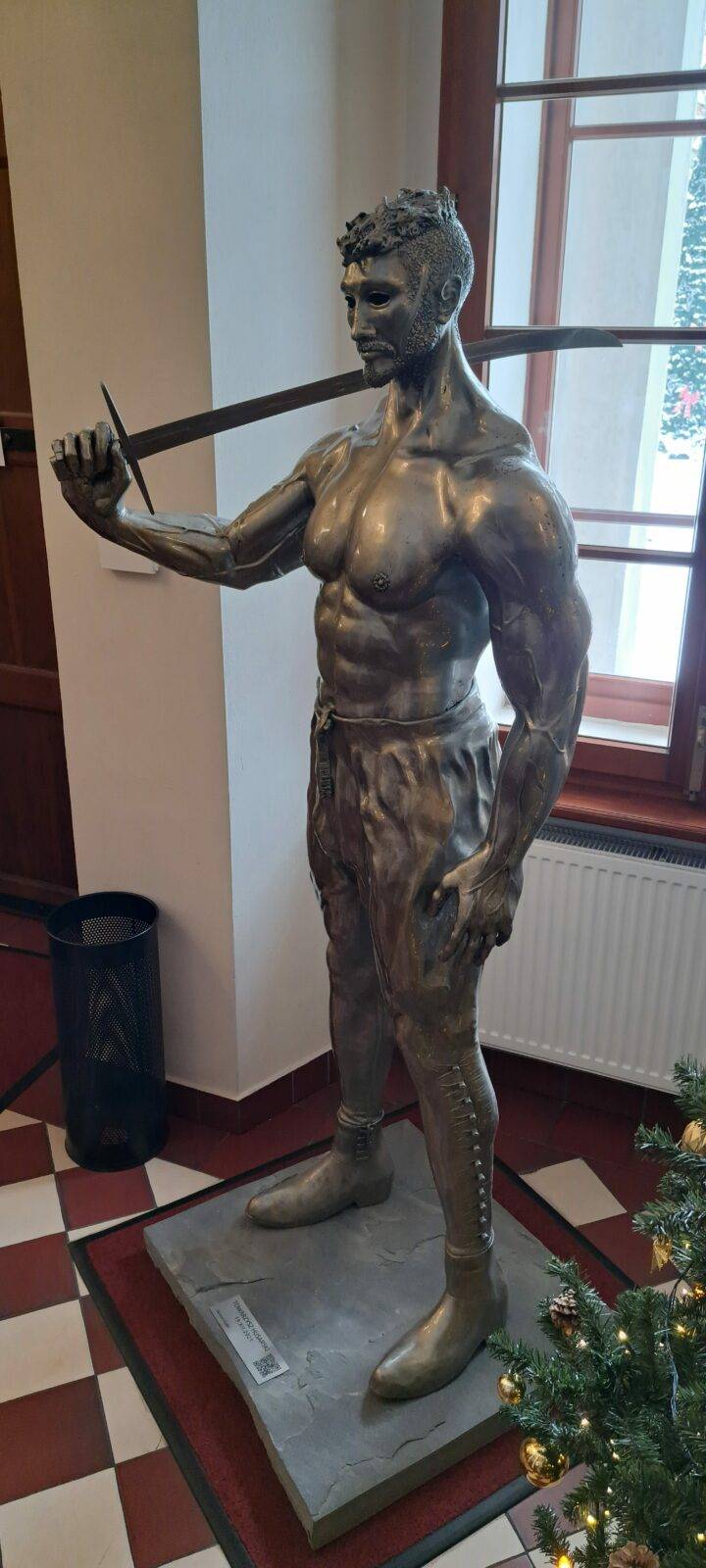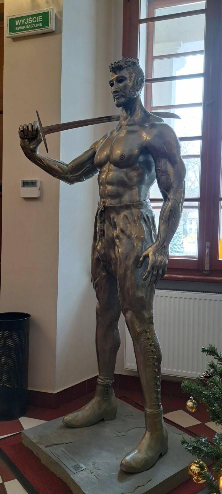 The sculpture Hussar (19.XII.2021) is a monumental piece celebrating one of the most iconic warriors in Polish history – the Hussar. The muscular figure holding a “batorówka” saber honors this elite cavalry, renowned for their unmatched effectiveness on European battlefields. The expressive face and hollow eye sockets of the hussar reflect deep contemplation over the fate of the Polish-Lithuanian Commonwealth, echoing the sentiments captured in Jan Matejko’s painting Stańczyk.