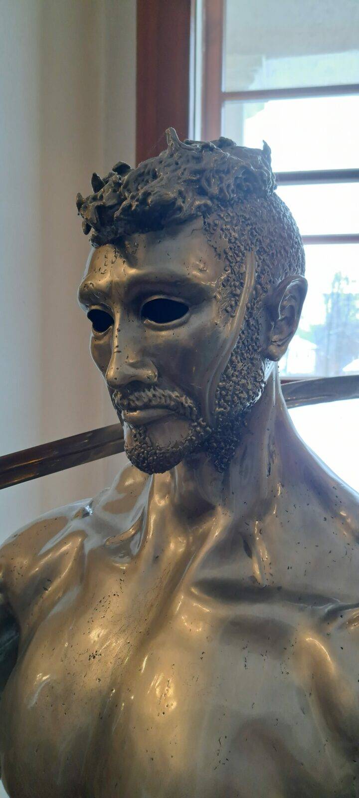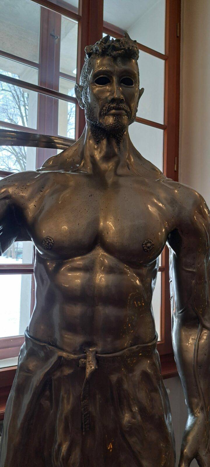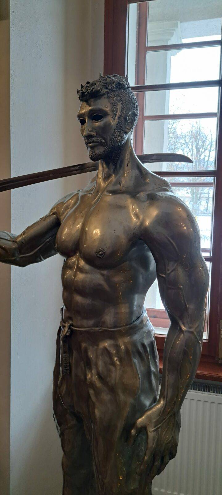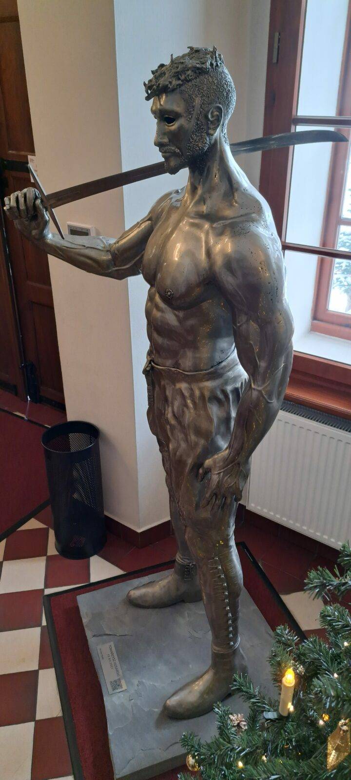 The sculpture Hussar (19.XII.2021) is a monumental piece celebrating one of the most iconic warriors in Polish history – the Hussar. The muscular figure holding a “batorówka” saber honors this elite cavalry, renowned for their unmatched effectiveness on European battlefields. The expressive face and hollow eye sockets of the hussar reflect deep contemplation over the fate of the Polish-Lithuanian Commonwealth, echoing the sentiments captured in Jan Matejko’s painting Stańczyk.