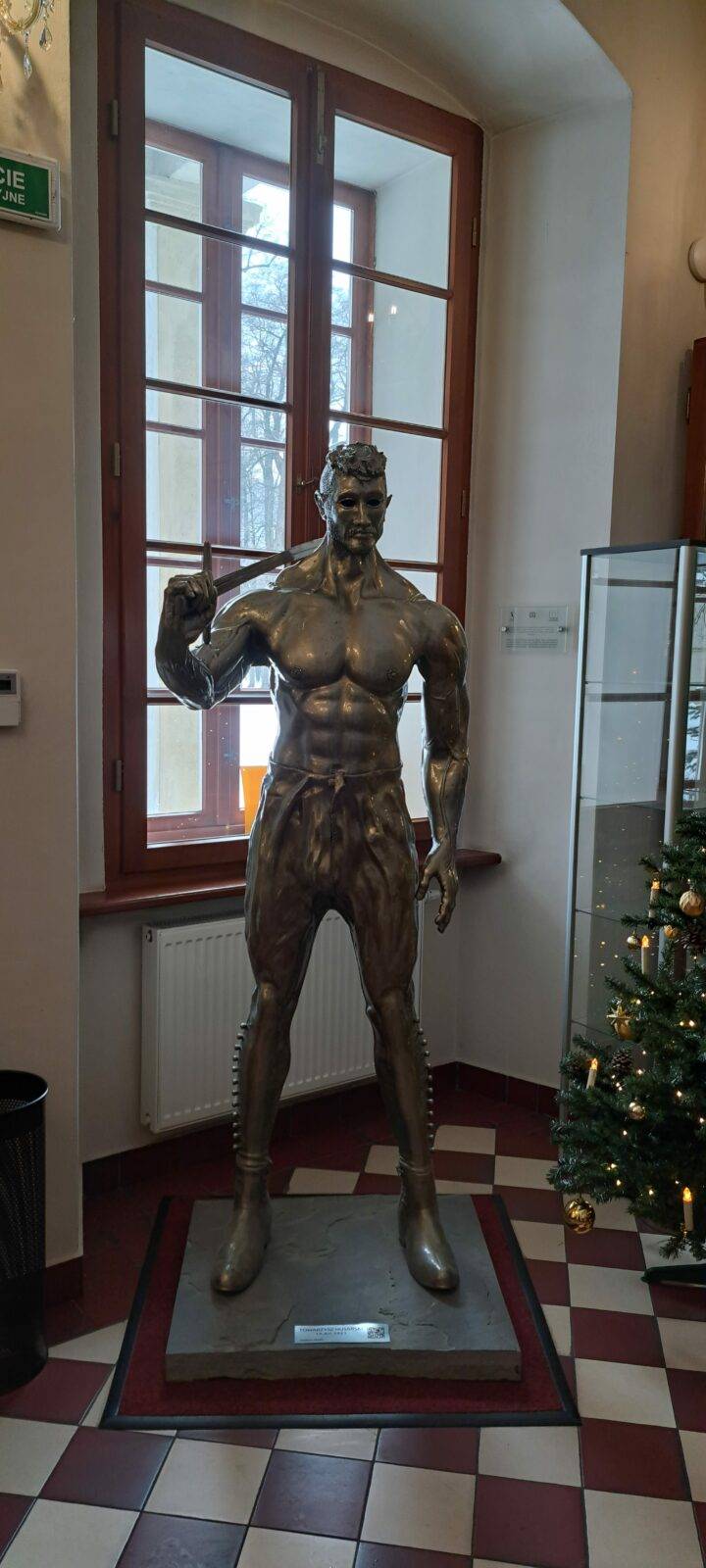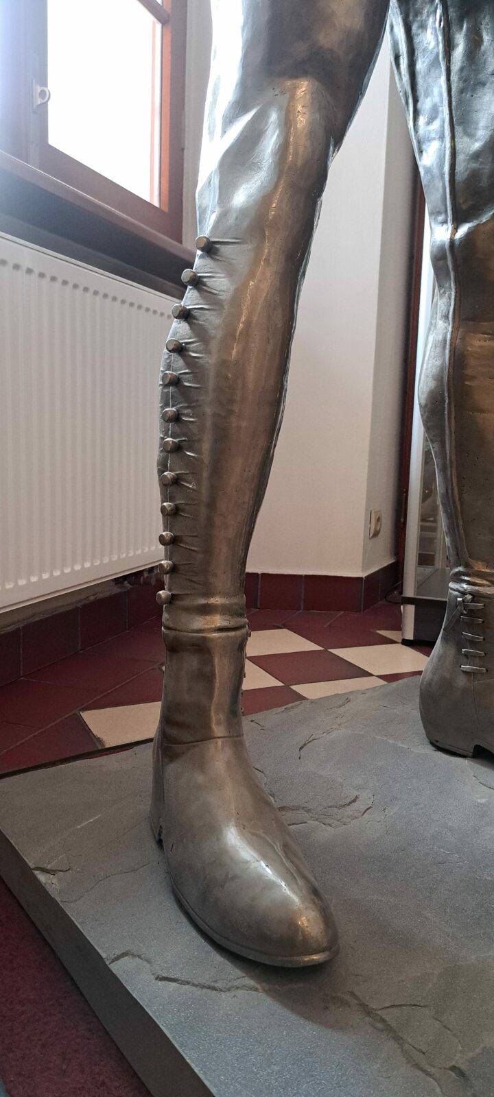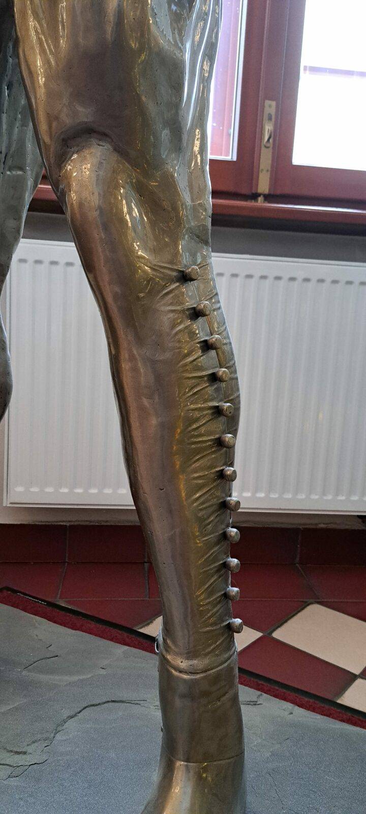 The sculpture portrays the Hussar with remarkable historical accuracy. The warrior wears traditional “portki” pants with buttons, historic boots, and holds a saber in his right hand. His hairstyle – the “czupryna” – references the signature look of Polish nobility. The defined musculature and visible veins symbolize the rigorous training that prepared Hussars for their role as defenders of their homeland.
