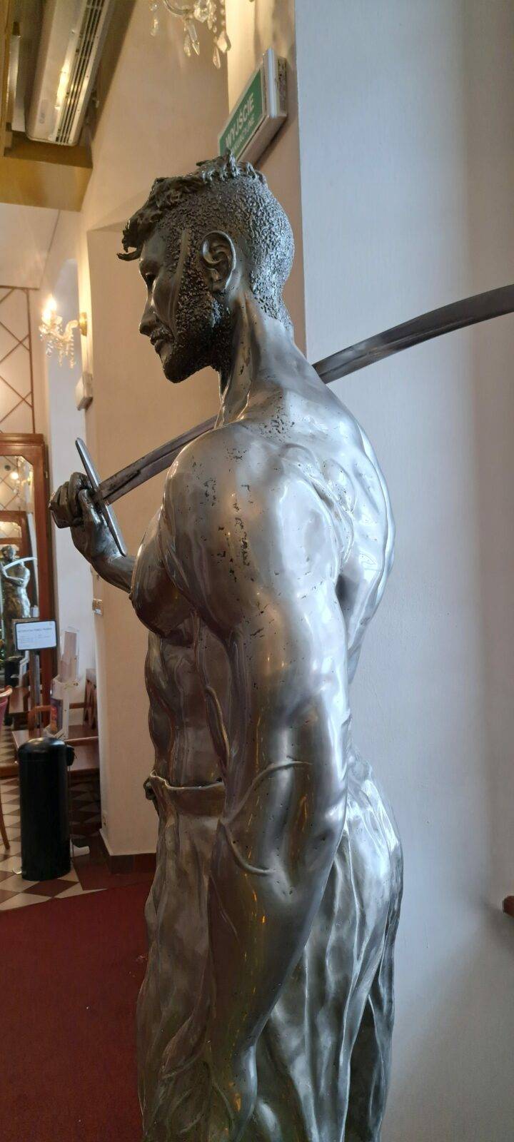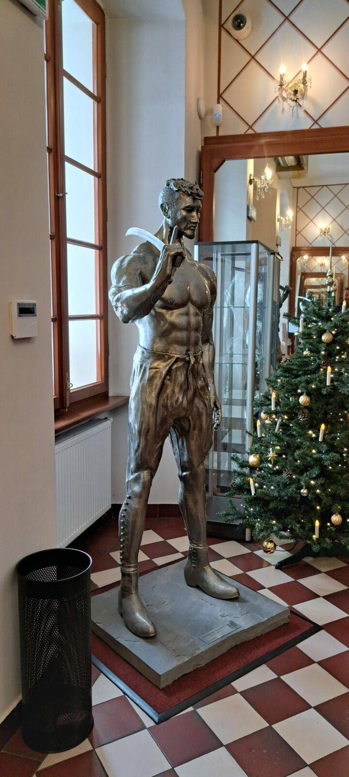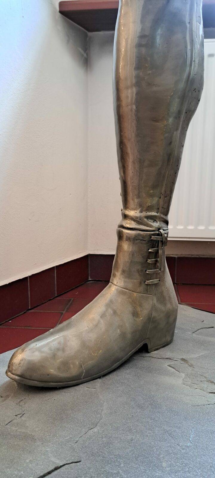 The sculpture portrays the Hussar with remarkable historical accuracy. The warrior wears traditional “portki” pants with buttons, historic boots, and holds a saber in his right hand. His hairstyle – the “czupryna” – references the signature look of Polish nobility. The defined musculature and visible veins symbolize the rigorous training that prepared Hussars for their role as defenders of their homeland.